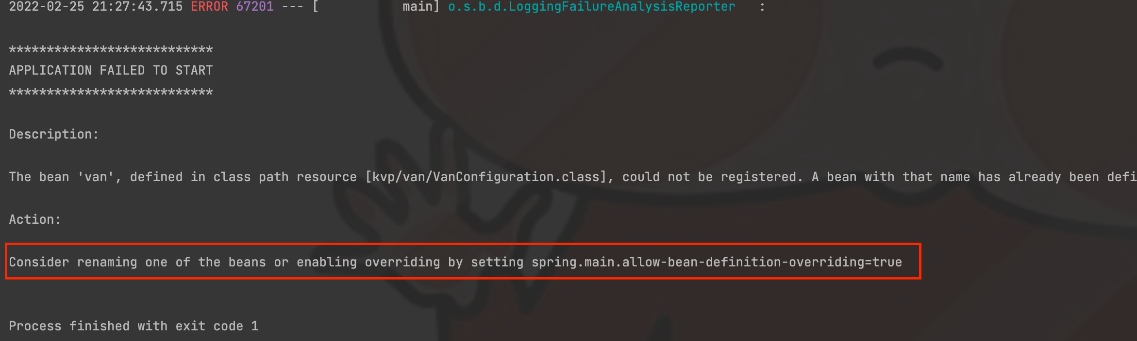 Description: The bean 'van', defined in class path resource [kvp/van/VanConfiguration.class], could not be registered. A bean with that name has already been defined in kvp.van.springboot.SpringbootApplication and overriding is disabled.이유는 Bean Overriding기능의 default값이 false로 변경되었기 때문!